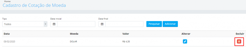Para excluir alguma cotação de moeda, basta clicar em “Pesquisar” e, em seguida, clique na “Lixeira” correspondente a linha que contém a cotação de moeda a ser excluída.