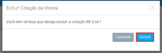 Após clicar na “Lixeira”, você deverá confirmar se deseja excluir. Caso sim, clique em “Excluir” para que a cotação da moeda seja excluída.