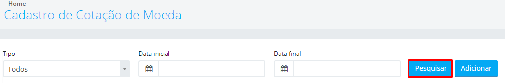 Para listar as cotações da moeda, clique em “Pesquisar”. Caso queira filtrar os resultados, basta preencher e selecionar os filtros necessários. Para pesquisar todos, deixe todos os campos em branco, selecionados em “Todos” e clique em “Pesquisar”.