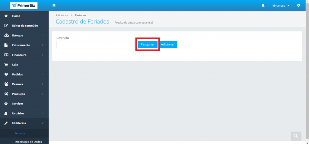 Para listar os feriados, clique em “Pesquisar”. Caso queira filtrar os resultados, basta preencher o filtro necessário. Para pesquisar todos, deixe o campo “Descrição” em branco e clique em “Pesquisar”.