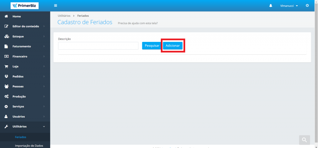 Para cadastrar um Feriado, clique no botão “Adicionar”.