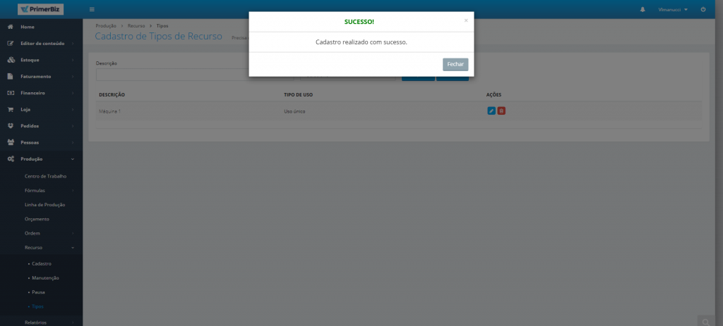 Após clicar no “Lápis”, os campos já estarão preenchidos com as informações do tipo de recurso que será alterado. Agora basta modificar os campos e clicar em “Salvar” para que o tipo de recurso seja alterado.