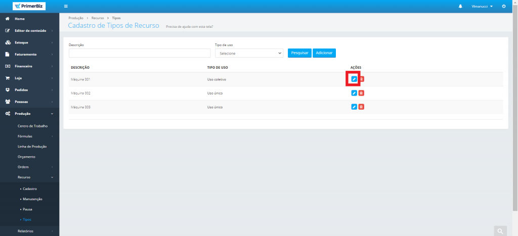 Para atualizar algum tipo de recurso, basta clicar em “Pesquisar” e, em seguida, clique no “Lápis” correspondente a linha que contém o tipo de recurso a ser alterado.