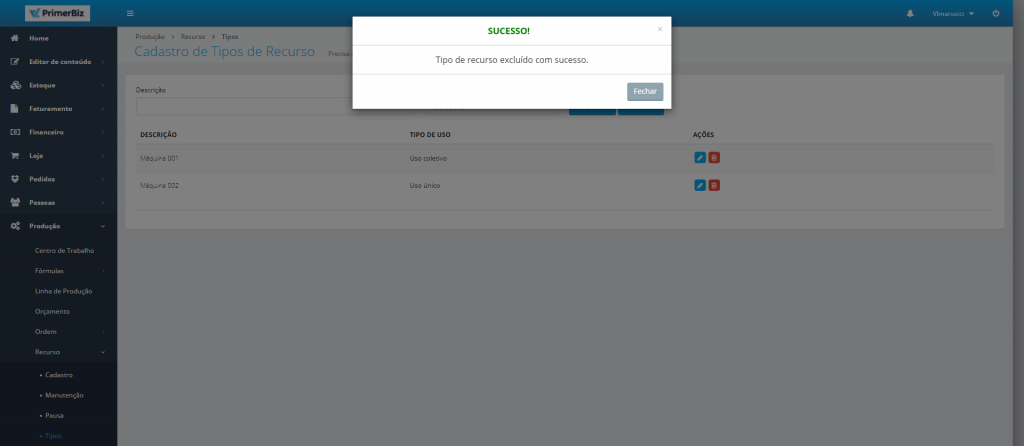 Após clicar na “Lixeira”, confirmar se deseja realmente excluir o item. Caso sim, confirme em “Excluir” para que o tipo de recurso seja excluído.
