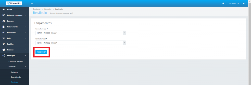 Após selecionar as fórmulas, clique em “Recalcular” para recalcular os custos das fórmulas.