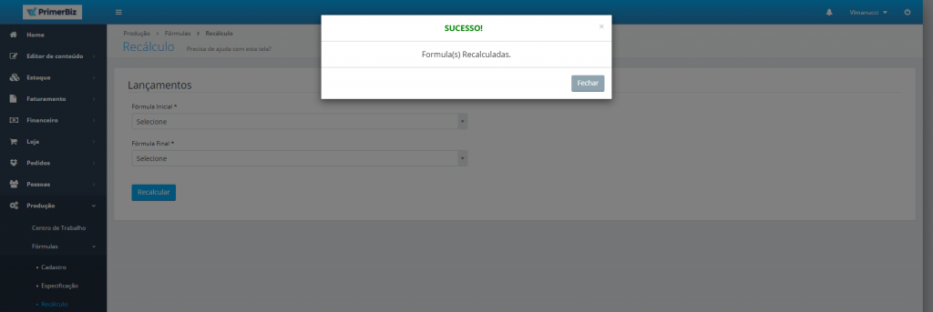 Em seguida, uma mensagem confirmando o Sucesso no recálculo da fórmula aparecerá, conforme tela abaixo.