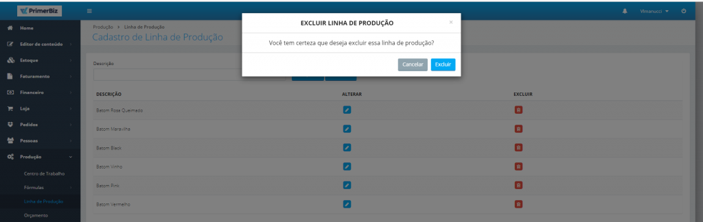 Após alterar a nomenclatura da linha de produção, clique no botão “Salvar” para salvar a modificação. Caso queira cancelar a alteração, basta clicar em “Cancelar”.